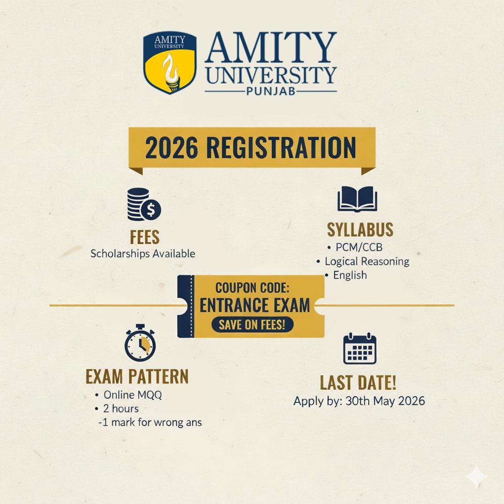 Are you planning to apply for Amity University Mohali 2026 admissions? Here’s great news! Students can now avail exciting offers through the Amity Mohali 2026 Registration Coupon Code for a limited time. Amity University Mohali is one of India’s top private universities known for its modern infrastructure, global exposure, and excellent placement records. This guide covers everything — from the registration process and exam pattern to fees, syllabus, and the last date to apply.