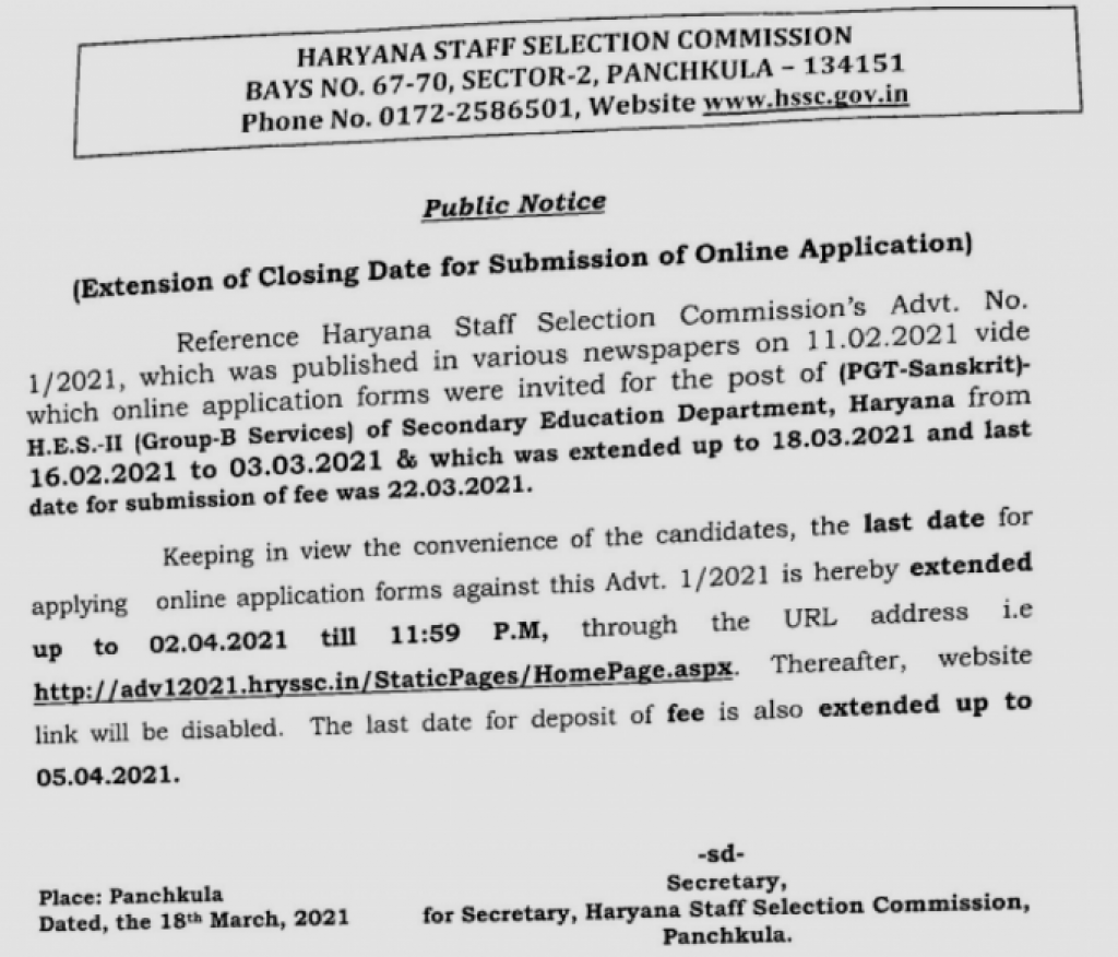 The eligible candidates can now apply online for HSSC PGT Sanskrit H.E.S.-II Group‐B Services from the direct link below till 02nd April 2021 which has been again extended as per the notice. No offline application form or copy of the downloaded application form will be accepted by the Haryana Staff Selection Commission. The candidates who have not yet applied for the post can now apply much before 02nd April to avoid any technical glitch.