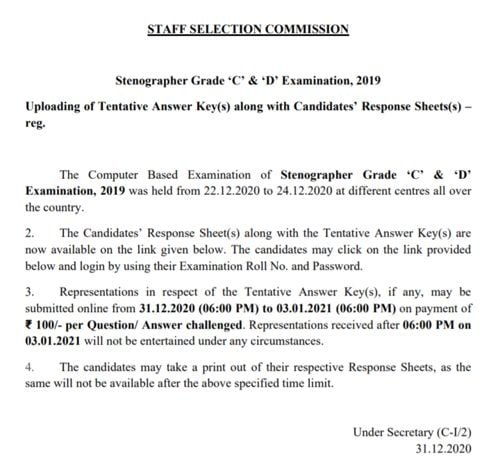 The facility to file representations of answer key for SSC Stenographer 2019-20 Exam will be available from 31 December 2020 (06:00 PM) to 03 January 2021 (06:00 PM) on payment of ₹ 100/- per Question/ Answer challenged. Representations received post 06:00 PM on 03 January 2021 will not be attend to under any circumstances.