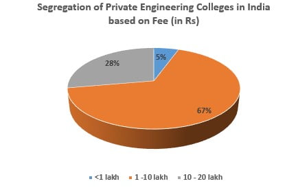 Based on the below pie chart, it can be estimated that pursuing Private Engineering Courses in India from top-rated colleges is expensive. Around 67% of top Engineering colleges in India have a course/annual fee that ranges from Rs 1-10 lakh. Some of these colleges are: