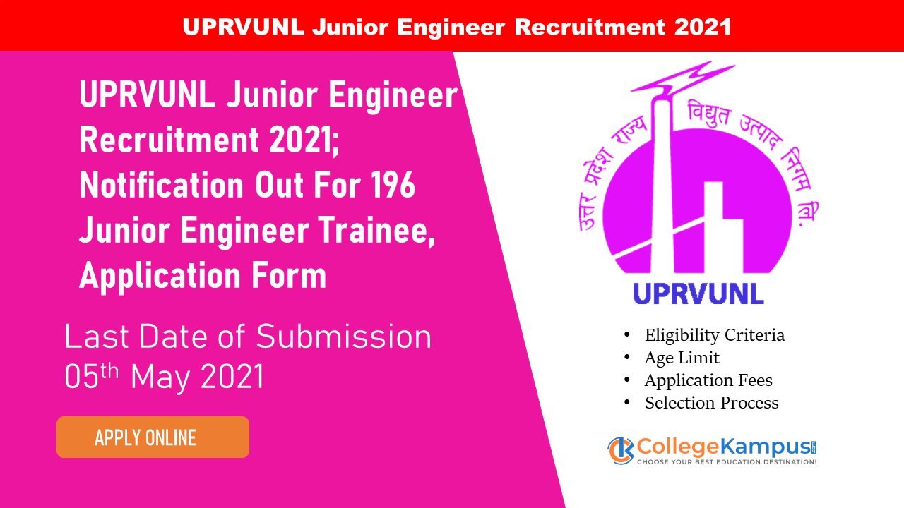 UPRVUNL JE Recruitment 2021: Uttar Pradesh Rajya Vidyut Utpadan Nigam Limited (UPRVUNL) has released a politician notification for the post of Junior Engineer (Trainee) Electrical, Electronics & Instrumentation, Mechanical, and Computer on 20th March 2021 on its official website. a complete of 196 vacancies are notified for the UPRVUNL Recruitment 2021. the web registration process are going to be active from 10th April 2021 to 05th May 2021. Stay tuned with us, we’ll notify you with every latest update for UPRVUNL JE vacancies here.