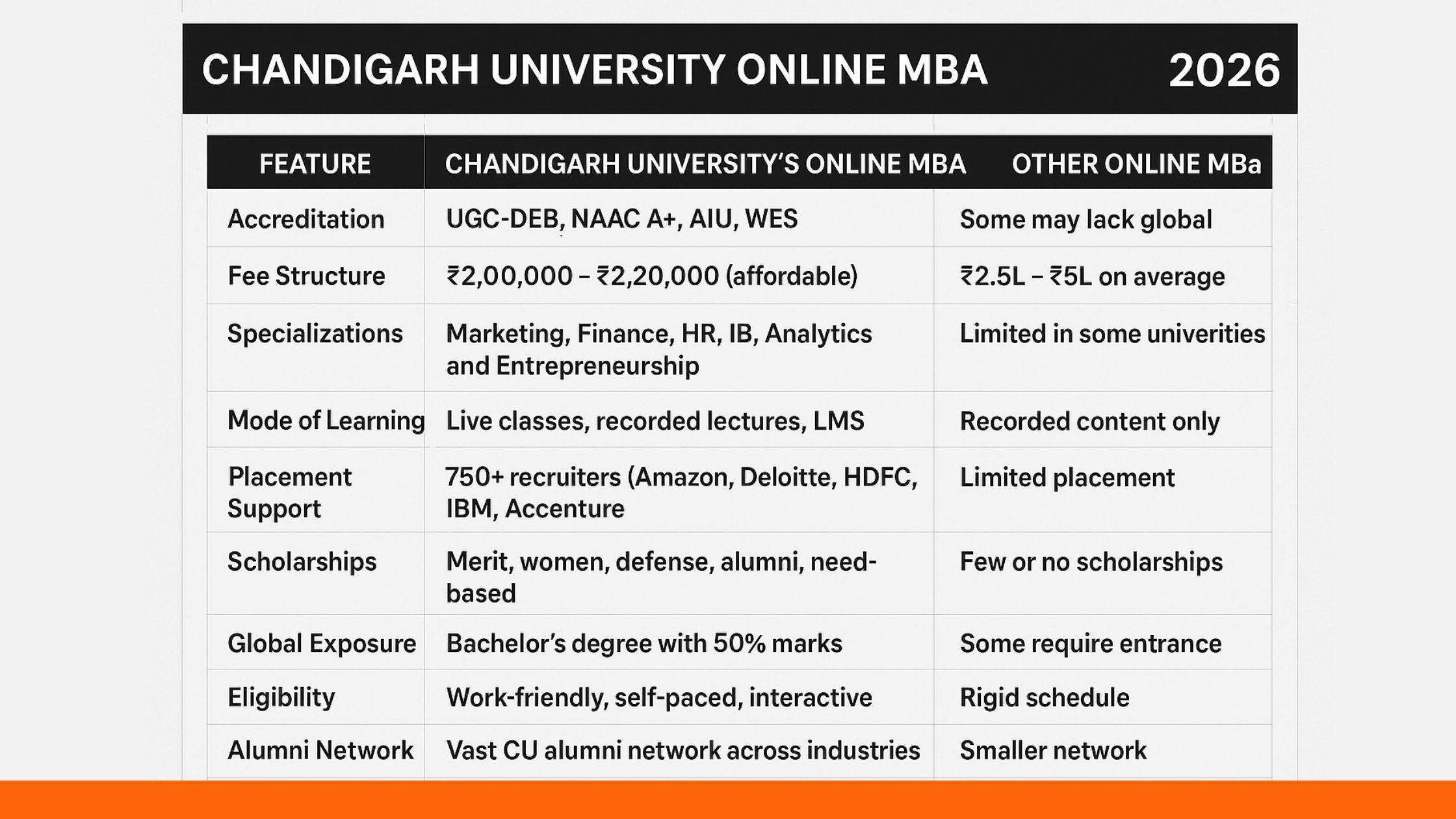 | Feature | Chandigarh University’s Online MBA | Other Online MBA Colleges |