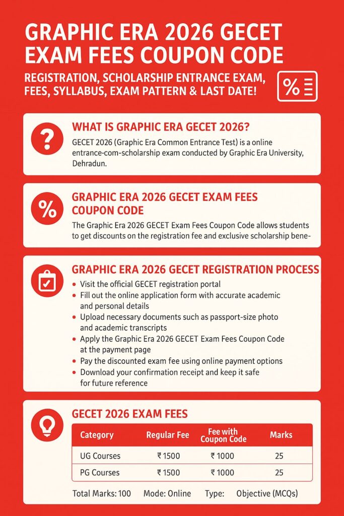 If you’re planning to join Graphic Era University in 2026, here’s some great news! The Graphic Era 2026 GECET Exam Fees Coupon Code gives students an exclusive opportunity to save on registration and enjoy scholarship benefits. The GECET (Graphic Era Common Entrance Test) is a university-level scholarship and admission exam for various undergraduate and postgraduate programs. This article covers everything you need to know — from registration process, exam pattern, syllabus, and fees to how you can use the coupon code for maximum savings.