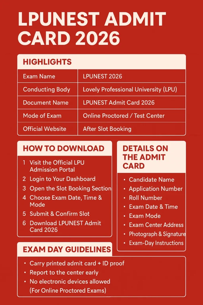 The LPUNEST admit card 2026 is an essential and mandatory document for all candidates appearing in the LPUNEST examination. Available immediately after slot booking, it includes important exam information such as timings, center details, guidelines, and ID requirements. Students must ensure that all details on the admit card are correct and follow all exam instructions for a smooth examination experience.