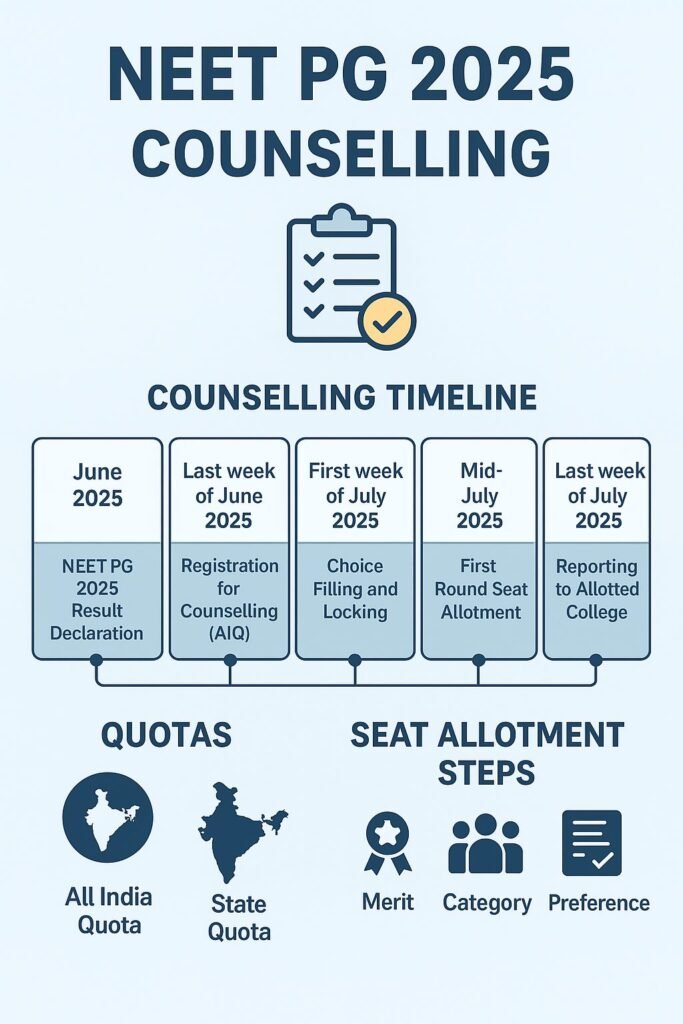 NEET PG 2025 Counselling is the gateway for medical graduates to secure seats in India’s premier medical institutions. By staying informed about dates, understanding the counselling process, and preparing the required documents in advance, candidates can maximize their chances of getting a seat in their preferred college. Remember, timely registration, wise choice filling, and awareness of quotas are key factors in achieving success in NEET PG 2025 Counselling.
