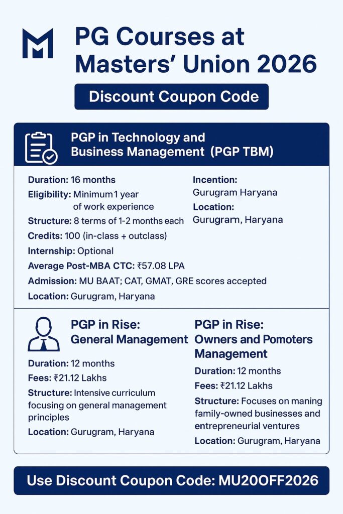 Masters’ Union, one of India’s leading industry-focused business schools, continues to attract ambitious professionals seeking to advance their careers. As the 2026 academic session approaches, students are eager to know about the available PG Courses at Masters’ Union 2026 and any discount coupon codes to make their education more affordable. This article provides a detailed guide on all PG programs, fees, and opportunities at Masters’ Union.