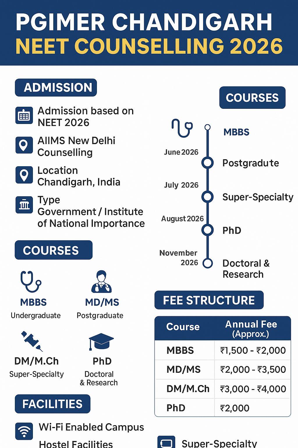 The PGIMER Chandigarh NEET Counselling 2026 process, conducted through AIIMS New Delhi NEET Counselling 2026, offers deserving candidates a gateway to one of the most respected medical institutions in India. With its outstanding faculty, affordable education, modern infrastructure, and top national ranking, PGIMER Chandigarh continues to shape the future of India’s healthcare sector.