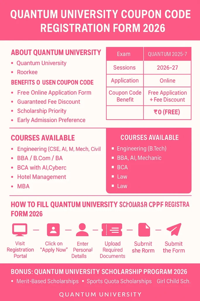 This article provides a detailed guide on how to apply using the Quantum University Coupon Code, eligibility requirements, benefits, steps to fill the registration form, important dates, program details, scholarship insights, and frequently asked questions.
