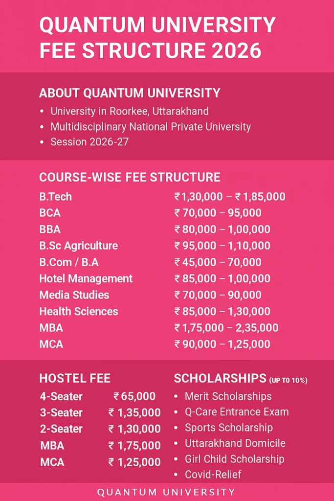 This detailed guide provides a complete breakdown of the Quantum University fee structure 2026, including course-wise fees, hostel charges, scholarship options, admission fee details, exam fees, payment modes, and frequently asked questions.