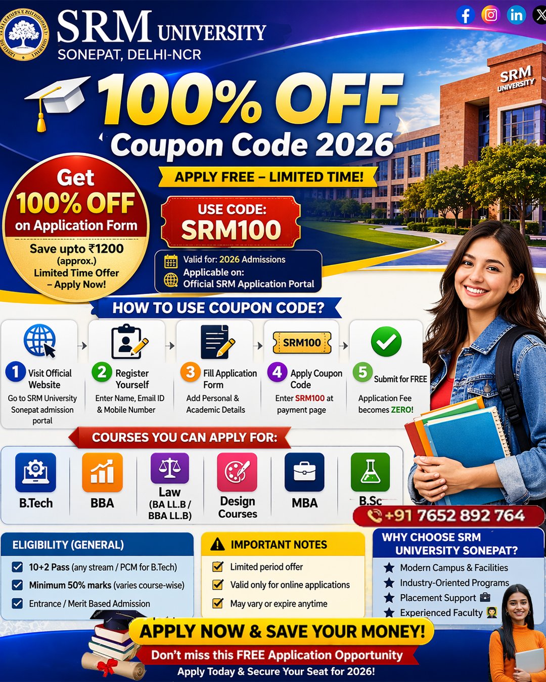 The SRM University Sonipat 100% OFF Coupon Code 2026 is a special promotional offer that allows students to: