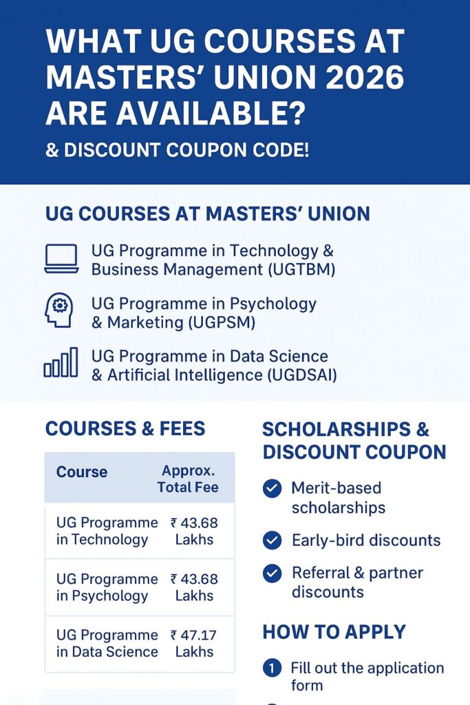 This article covers everything you need to know about UG Courses at Masters’ Union 2026, including course details, fees, eligibility, scholarships, and how to grab a discount coupon code during admissions.
