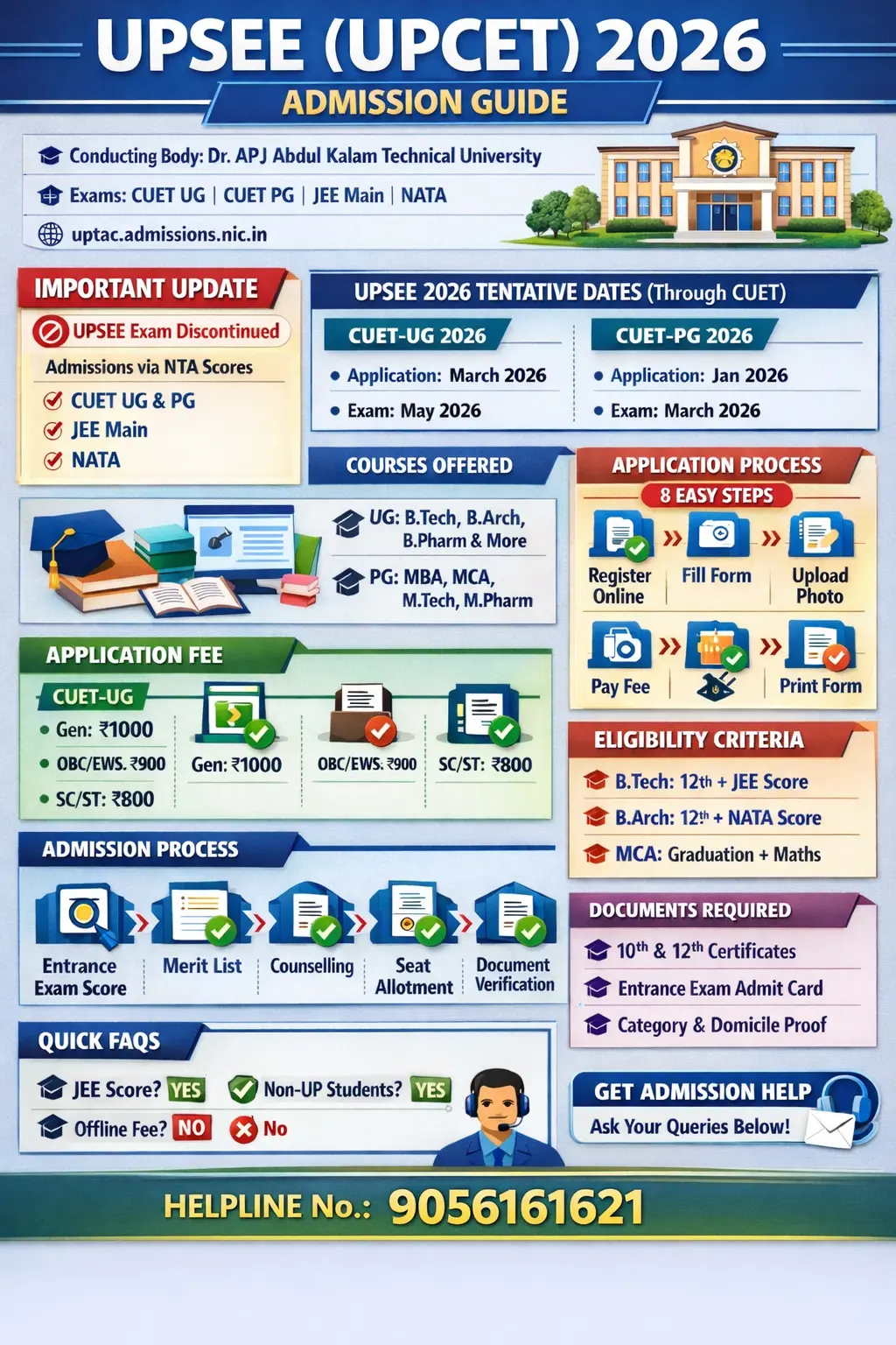The UPSEE 2026 Application Form will be released in online mode for admission to various Undergraduate and Postgraduate programs in Uttar Pradesh. Earlier, UPSEE (also known as UPCET) was conducted as a state-level entrance examination by Dr. A.P.J. Abdul Kalam Technical University. However, the entrance exam has now been discontinued.