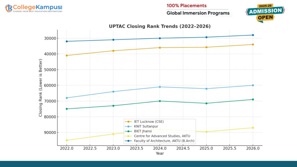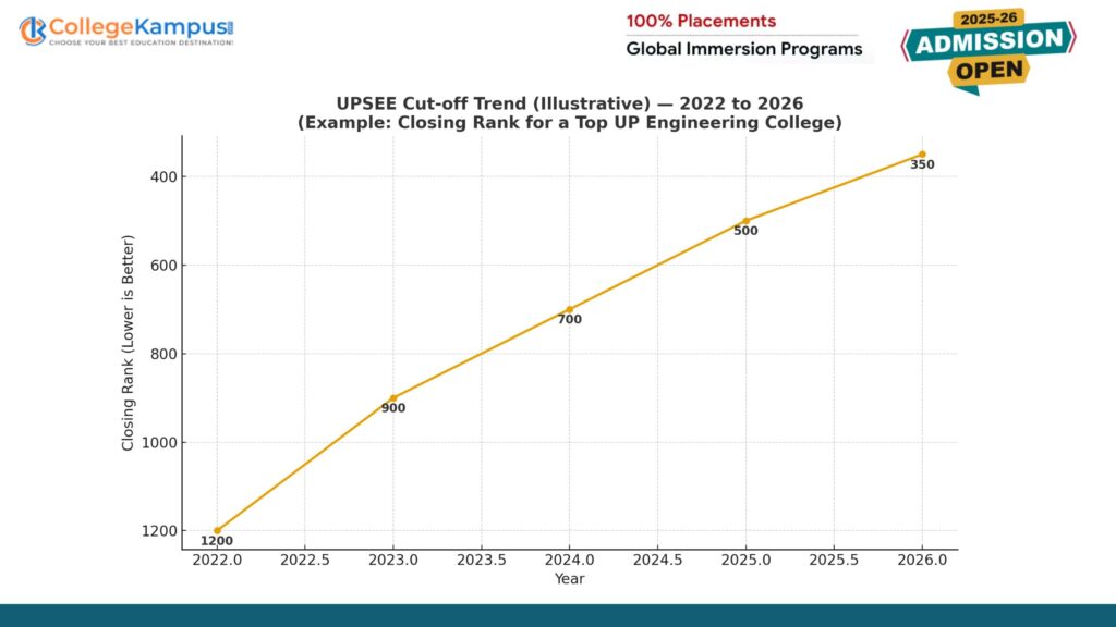 Illustrative line chart showing the UPSEE cut-off trend (2022–2026) for a top UP engineering college (closing rank trend). The chart is attached above.